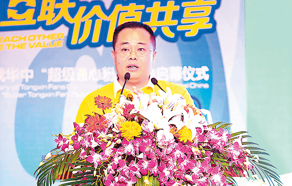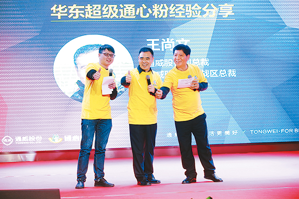 劉漢元主席向通威股份副總裁兼華中一區(qū)總裁沈金竹、華中二區(qū)總裁幸鵬傳遞“2017尋找超級通心粉”活動(dòng)大旗隨著劉漢元主席從王總手中接過“超級通心粉”的活動(dòng)旗幟,并將其傳遞給通威股份副總裁兼華中一區(qū)總裁沈金竹、華中二區(qū)總裁幸鵬手中,2017年尋找華中“超級通心粉”活動(dòng)正式啟動(dòng)!沈總發(fā)言中表示, 2017尋找華中“超級通心粉”活動(dòng)對進(jìn)一步助力華中戰(zhàn)區(qū)的市場營銷,是一個(gè)難得的契機(jī),并表示將通過這次活動(dòng)深度聯(lián)動(dòng)戰(zhàn)區(qū)客戶、粉絲,打通線上線下服務(wù)和推廣渠道,借勢拓展新客戶,全面助推華中一區(qū)2017年各項(xiàng)任務(wù)指標(biāo)的順利完成!
