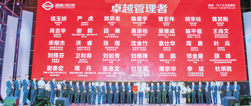 在通威三十五年慶的特別日子里,通威特別遴選了65位與通威相知、相伴、相守的“超級通心粉”代表,以及105位與通威共同成長、發展、進步的榮譽通威人,分別設置通威股份華中戰區“超級通心粉”、全球“超級通心粉”、“通威三十五年”終身榮譽通威人、“通威三十五年”優秀員工、“通威三十五年”卓越管理者五項榮譽,并在通威三十五年慶典晚會上對他們進行隆重表彰!十一屆全國政協常委、通威集團董事局劉漢元主席,通威集團管亞梅董事長,通威集團禚玉嬌總裁,通威股份嚴虎副董事長及通威股份郭異忠總裁親自為獲獎者現場頒獎!