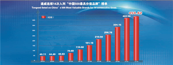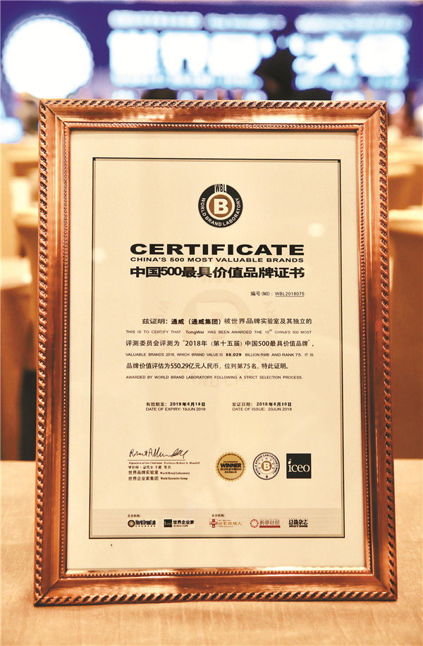 6月20日,2018年第十五屆世界品牌大會暨中國500最具價值品牌發(fā)布會在北京隆重舉行。繼去年品牌價值突破450億元后,今年通威集團(tuán)以550.29億元的品牌價值再次榮列榜單,連續(xù)15年入選公信力和認(rèn)同度最高、權(quán)威性最強(qiáng)的中國品牌國家隊(duì)行列。