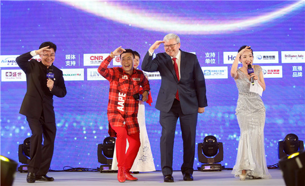 澳大利亞前總理、美國亞洲協(xié)會政策研究院院長陸克文與著名演員六小齡童在臺上互動