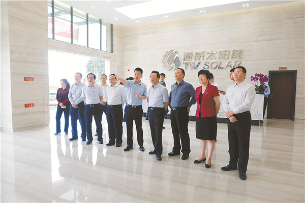 陳昌智副委員長在調研期間詳細了解了通威新能源產業發展現狀、綠色發展規劃。得知通威太陽能超高效疊瓦組件最高發電輸出功率達421.9W,打破組件世界紀錄時,陳昌智副委員長表示,通威敢為人先,將清潔能源生產與先進的智能制造相結合,打造出全球領先的“智能工廠”,發展成果值得高度贊賞,希望通威繼續強化創新,勵精圖治,勇立潮頭,引領和推動我國乃至全球光伏行業更好更快地發展。
