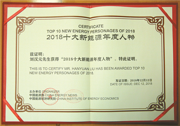 “2018 中國十大新能源年度人物”榮譽證書