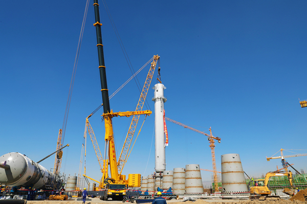 9月8日09:38分,內蒙古通威高純晶硅公司二期項目精餾裝置首吊成功。本次作業由400噸大型履帶吊車、500噸汽車吊車配合完成。為保證本次吊裝作業順利進行,項目部前期做足了地面組合、保溫施工、平臺施工、塔體清洗、塔體附件施工等準備。公司各專業技術人員,對各工序作業嚴格檢查、清單核對。安裝組牽頭反復對《吊裝方案》審核修訂,并組織進行CAD吊裝模擬測試,同時聘請了專家組論證。9月7日,公司再次組織進行了清單確認檢查。9月8日,按計劃順利完成二期項目精餾裝置首吊。本次首吊成功,極大地鼓舞士氣,同時為后續精餾塔吊裝作業積累經驗。