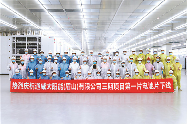 通威太陽能眉山基地三期高效晶硅電池項目第一片電池片順利下線合影留念