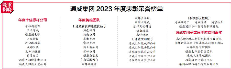 在當天的年度表彰環(huán)節(jié)中,2023年通威集團十佳標桿公司、2023通威年度英雄團隊、通威集團董事局主席特別嘉獎隆重揭曉。回眸2023,我們聚焦主業(yè)、敢拼善為;展望2024,我們踔厲奮發(fā)、勇毅前行。在劉漢元主席的堅強帶領(lǐng)下,全體通威人將永葆危機感與使命感,始終堅持效率優(yōu)先,始終堅持開拓創(chuàng)新,以時不我待的精神,勤練內(nèi)功,奮力在新時代新征程上贏得更大的勝利!