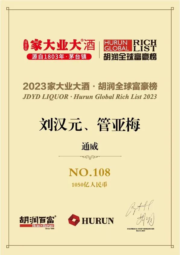 3月23日,2023胡潤全球富豪榜正式發布。這是胡潤研究院第十二年連續發布“全球富豪榜”。今年共有來自69個國家2356家公司的3112位十億美元企業家上榜。全國人大代表、全國工商聯副主席、通威集團董事局劉漢元主席,通威集團管亞梅董事長榮耀上榜。