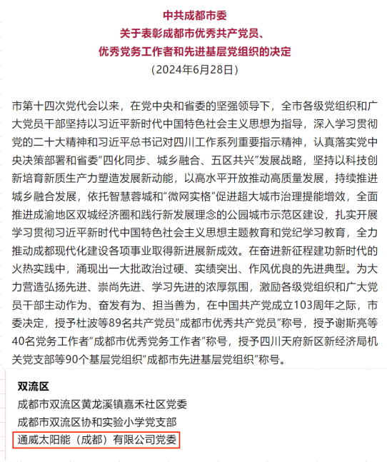7月1日,中共成都市委、淮州新城發(fā)布了關(guān)于表彰“兩優(yōu)一先”的決定,通合新能源(金堂)有限公司黨支部書(shū)記羅曉云榮獲2024年“成都市優(yōu)秀黨務(wù)工作者”稱號(hào),通合新能源黨支部榮獲“淮州新城先進(jìn)基層黨組織”,黨員王沙、陳日強(qiáng)同志分別榮獲“淮州新城優(yōu)秀共產(chǎn)黨員”“淮州新城優(yōu)秀黨務(wù)工作者”稱號(hào)。