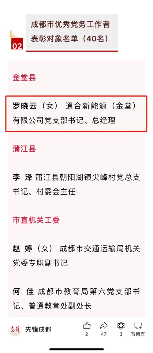 通合新能源(金堂)有限公司黨支部書(shū)記羅曉云榮獲“2024年成都市優(yōu)秀黨務(wù)工作者”榮譽(yù)稱(chēng)號(hào)