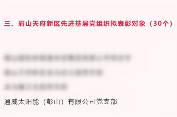 通威太陽能(彭山)有限公司黨支部榮獲眉山天府新區“先進基層黨組織”榮譽稱號