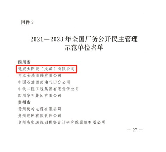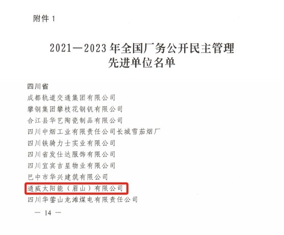 通威太陽能(成都)有限公司榮獲“全國廠務公開民主管理示范單位”