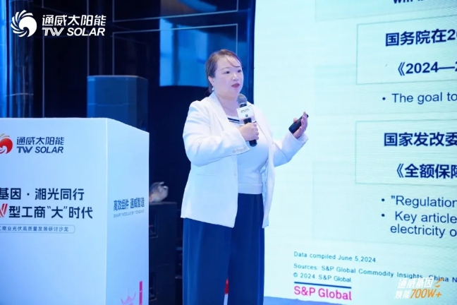 會議現場,來自標普全球、TüV萊茵、中國能源建設集團湖南省電力設計院的權威專家對工商業光伏市場趨勢、系統安裝設計進行了詳細解讀。專家指出,2024年上半年,國內光伏并網量仍然保持強勁態勢,各省并網量不斷突破。在用電需求逐年攀升、電力供給依賴外部供給的背景下,湖南省具有較大的光伏供電、調峰需求。
