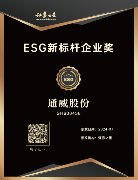 為表彰經濟效能與社會責任并重的綠色企業,為中國ESG發展提供示范性樣本,助力上市公司引領綠色發展,履行社會責任,提升公司治理水平,助推經濟可持續、高質量發展,本屆ESG研討會證券之星聯合華證指數發布了2024年《ESG投資價值TOP100榜單》,并頒發證券之星ESG新標桿企業獎。通威股份入選ESG投資價值TOP100榜單并榮獲證券之星ESG新標桿企業獎。