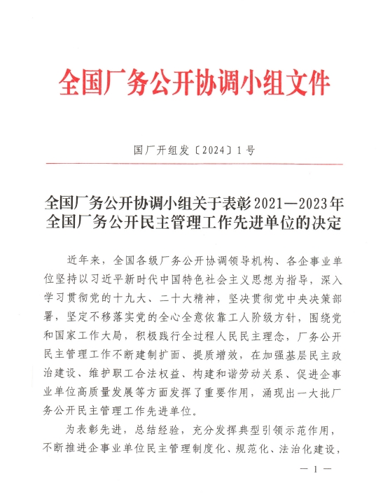 成都公司獲評(píng)“2021—2023年全國(guó)廠務(wù)公開(kāi)民主管理示范單位”