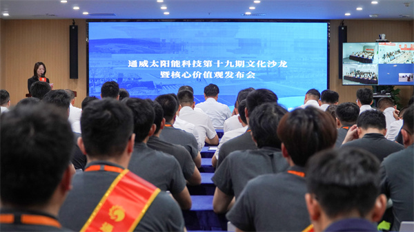 在分享環節,來自通威太陽能科技合肥、鹽城、金堂、南通四大基地不同部門的分享者們結合自身崗位經歷,從“安全第一、誠信為本、客戶至上、共贏共創”四個詞條進行講述,立足崗位、學習文化、思考文化,形成群策群力謀發展的良好氛圍。