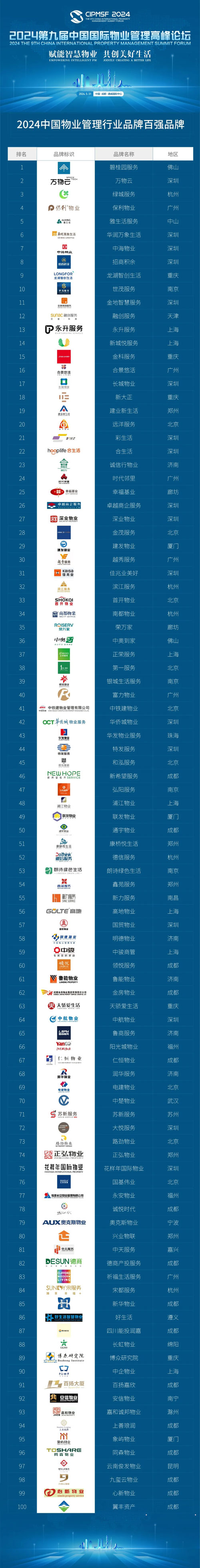 “2024中國物業管理行業百強品牌”名單