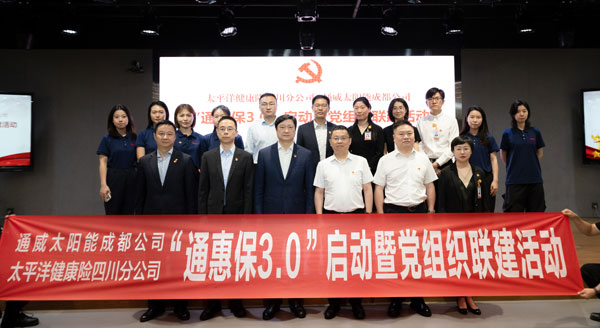 5月22日,太平洋健康保險(xiǎn)股份有限公司四川分公司與通威太陽(yáng)能(成都)有限公司共同舉辦的“通惠保3.0”啟動(dòng)儀式暨黨組織聯(lián)建活動(dòng)在通威太陽(yáng)能隆重舉行。太平洋健康險(xiǎn)黨委委員、副總經(jīng)理宋全華,太平洋健康險(xiǎn)四川分公司黨支部書記、總經(jīng)理陳裕豐,太平洋健康險(xiǎn)四川分公司副總經(jīng)理趙慶鋒,通威太陽(yáng)能總經(jīng)理周華,通威集團(tuán)黨委委員、通威股份人力資源總監(jiān)易繼成,通威太陽(yáng)能副總經(jīng)理、成都公司黨委書記王耀頤出席活動(dòng),雙方相關(guān)業(yè)務(wù)部門負(fù)責(zé)人及員工代表參加活動(dòng),共同見(jiàn)證雙方在保險(xiǎn)業(yè)務(wù)、黨建聯(lián)建開(kāi)啟深化合作新篇章。