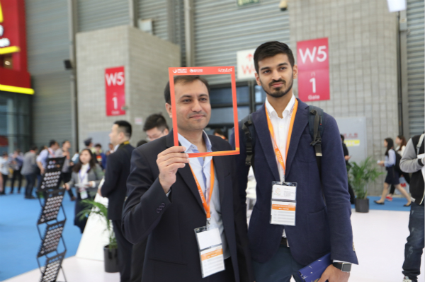 外國(guó)參展商拿起精心制作的雜志邊框合影留念