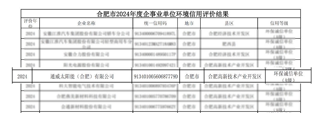 通威太陽能科技合肥基地獲評合肥市2024年度“環保誠信單位(A級)”