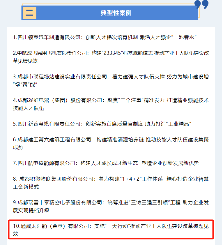 通威太陽(yáng)能(金堂)有限公司成功入選市級(jí)產(chǎn)業(yè)工人隊(duì)伍建設(shè)改革典型案例