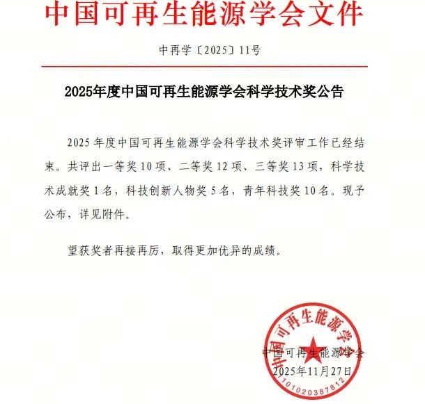 近日,“2025年度中國可再生能源學會科學技術獎”評選結果正式揭曉,通威“高效率低成本硅異質結(HJT)太陽電池技術”憑借在技術創新、成果轉化及行業引領等方面的突出表現,經過多輪嚴苛評審,成功斬獲科學技術獎一等獎。