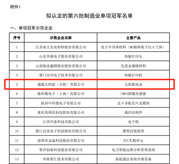 通威太陽能合肥基地獲評國家制造業單項冠軍示范企業