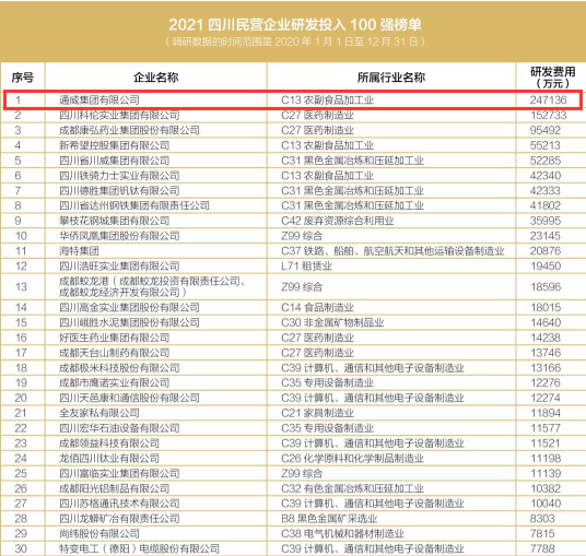 四川民企研發投入100強榜單發布,通威集團位居榜首
