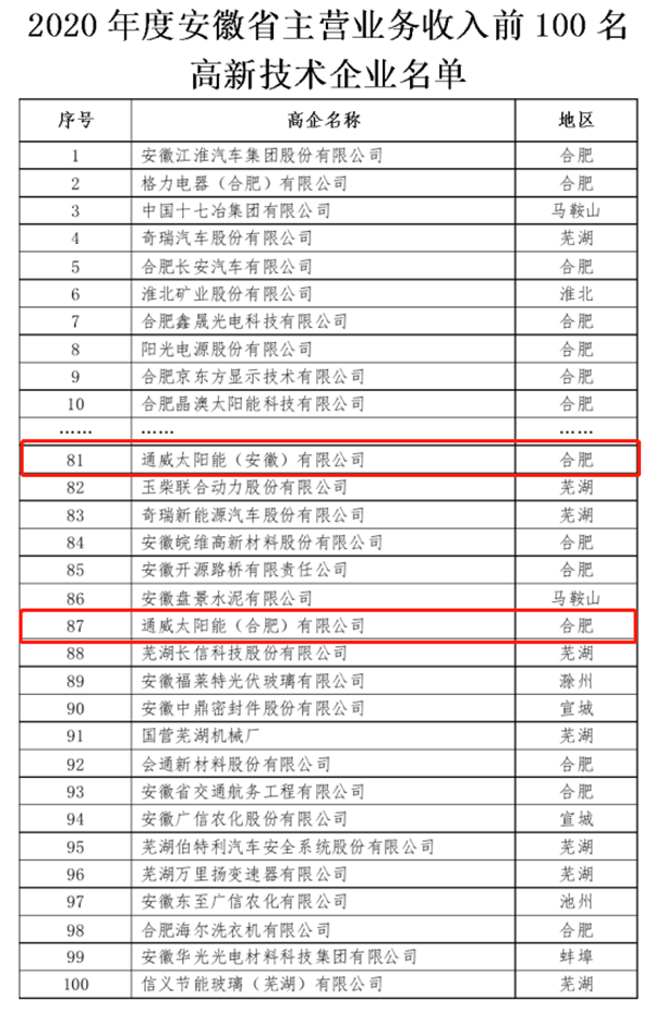 通威太陽能合肥基地榮列“2020年度安徽省主營業務收入前100名高新技術企業”榜單