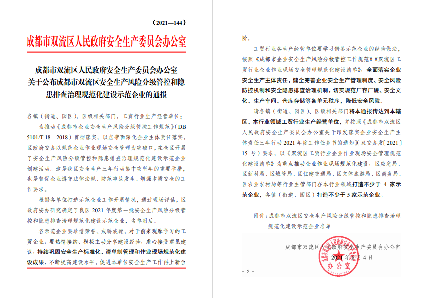 好主人公司榮獲雙流區安全生產風險分級管控和隱患排查治理規范化建設示范企業稱號