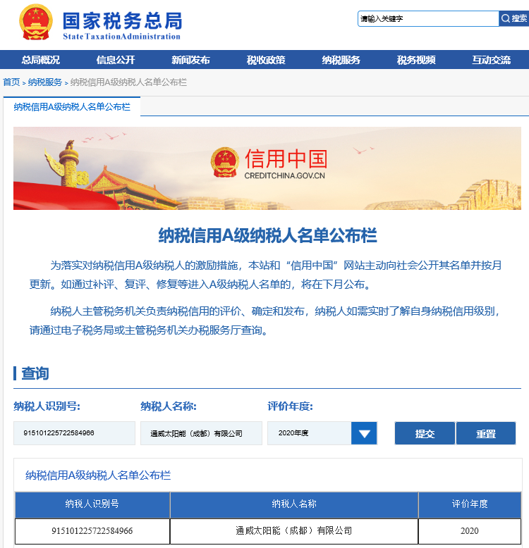 通威太陽能雙流基地連續六年榮膺“A級納稅人”稱號