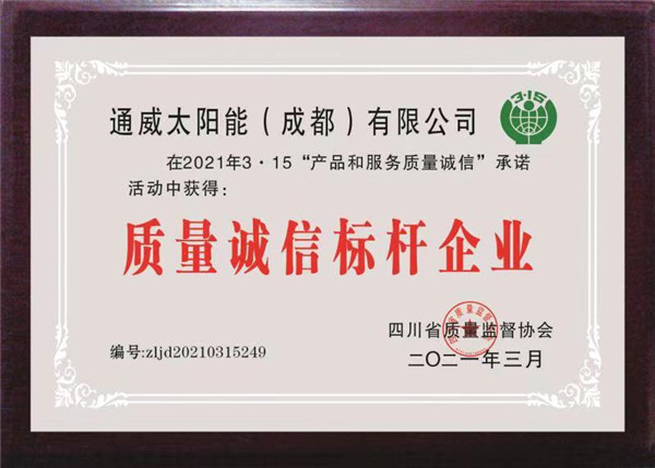 通威太陽能(成都)有限公司榮獲“四川省質量誠信標桿企業”稱號