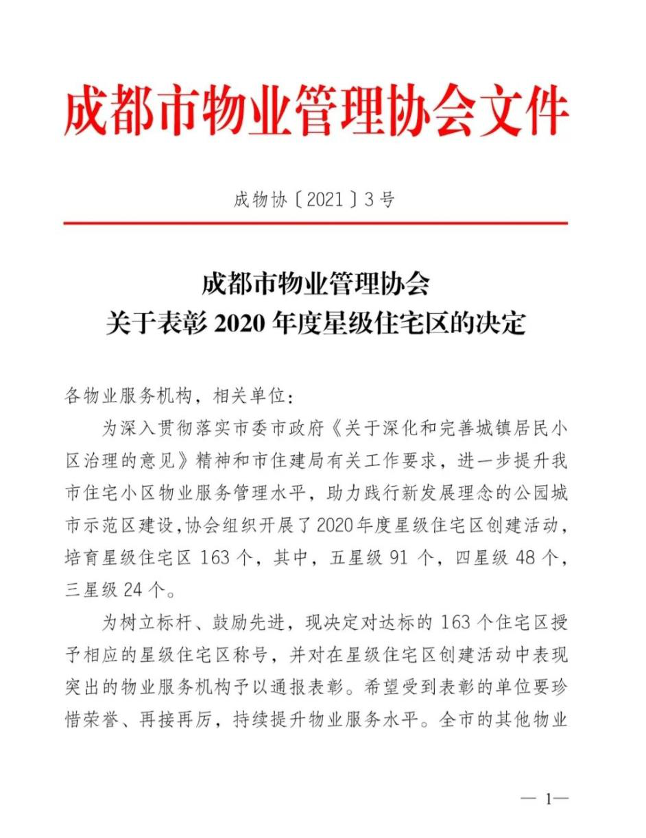 仙湖公館項(xiàng)目榮獲成都市五星級(jí)住宅區(qū)榮譽(yù)稱號(hào)