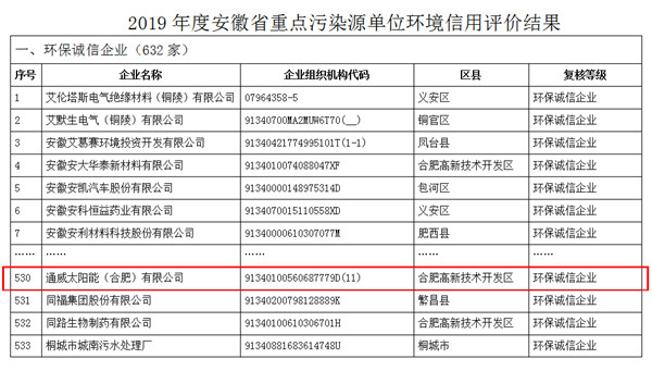 通威太陽能合肥公司榮獲2019年度安徽省環(huán)保誠信企業(yè)稱號