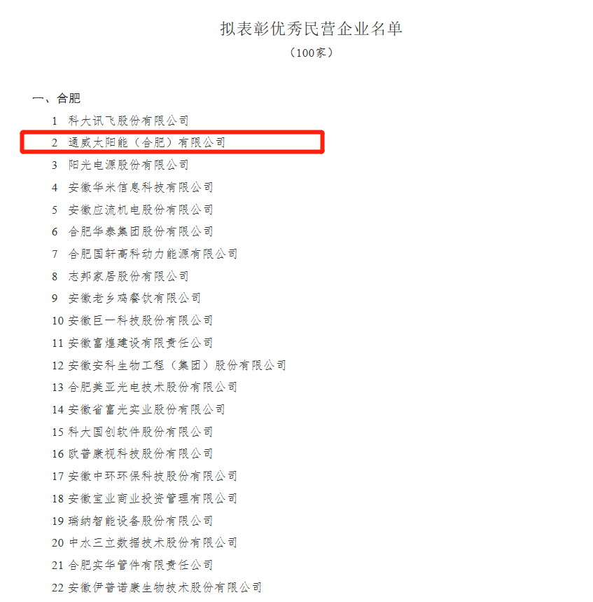 通威太陽能合肥公司榮獲安徽省優秀民營企業稱號