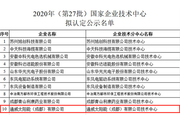 又一項國家級認證!通威太陽能成都公司榮獲“國家企業(yè)技術(shù)中心(分中心)”