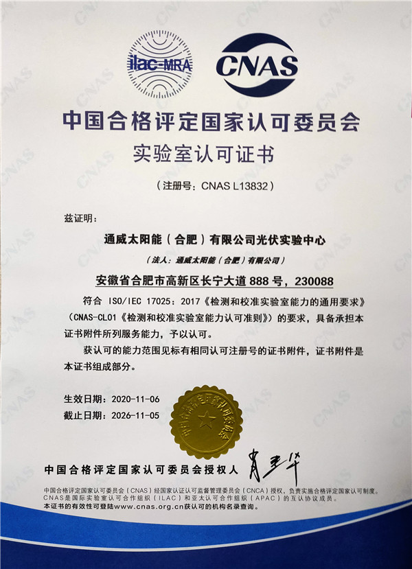 通威太陽能合肥公司光伏實驗中心榮獲CNAS認可資質(zhì)