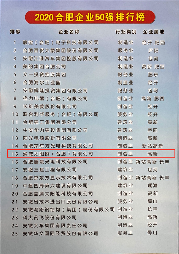 通威太陽能合肥公司榮列2020合肥企業50強、合肥制造業企業30強榜單