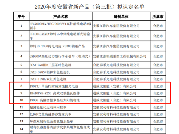 通威太陽能合肥基地三項新產品榮列“2020年度安徽省新產品(第三批)”名單