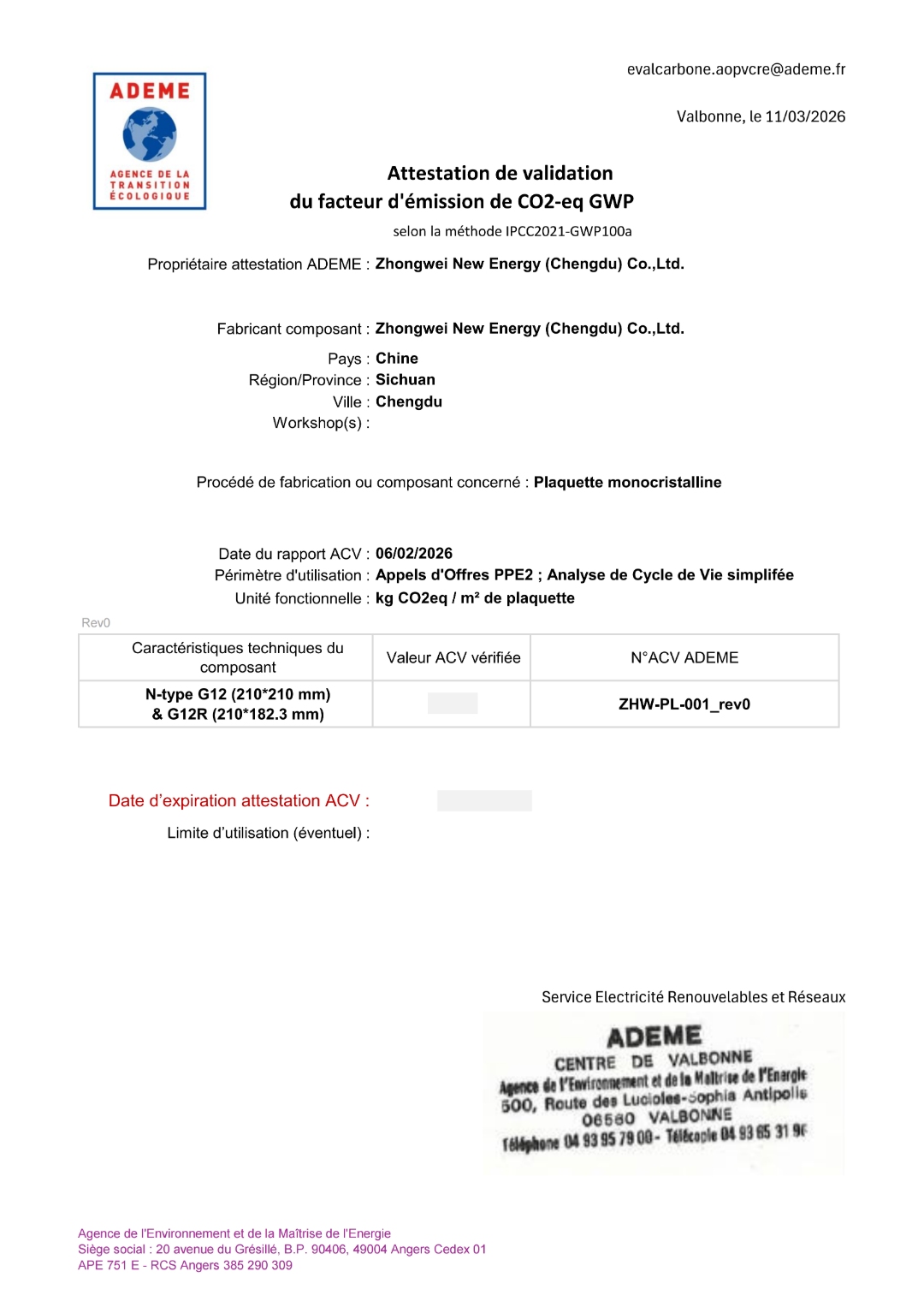 中威新能源(成都)有限公司單晶硅片產品榮獲法國碳足跡認證證書