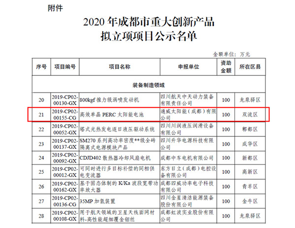 通威太陽能成都公司入列成都市重大創新產品名單