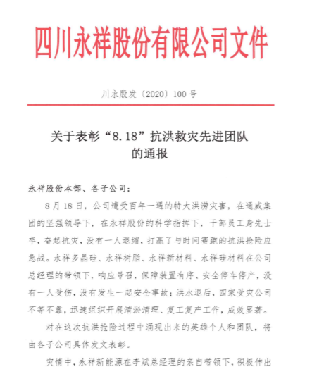 永祥股份開展“抗洪救災(zāi)”先進(jìn)團隊和個人表彰活動