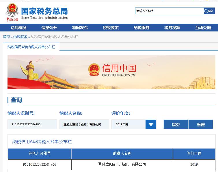 通威太陽能成都公司連續五年榮膺“A級納稅人”稱號