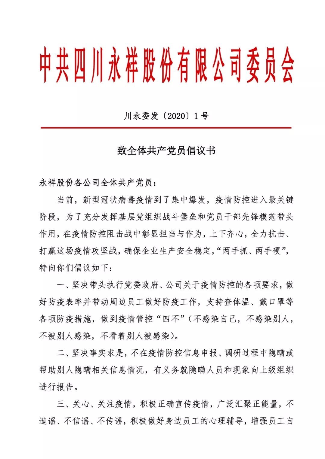 永祥黨委向全體黨員倡議:挑重擔、同防疫、保生產(chǎn) !