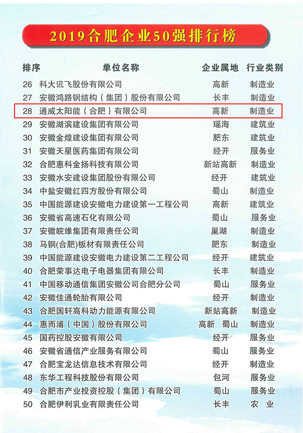通威太陽能合肥公司 榮列合肥企業(yè)50強、合肥制造業(yè)企業(yè)30強榜單