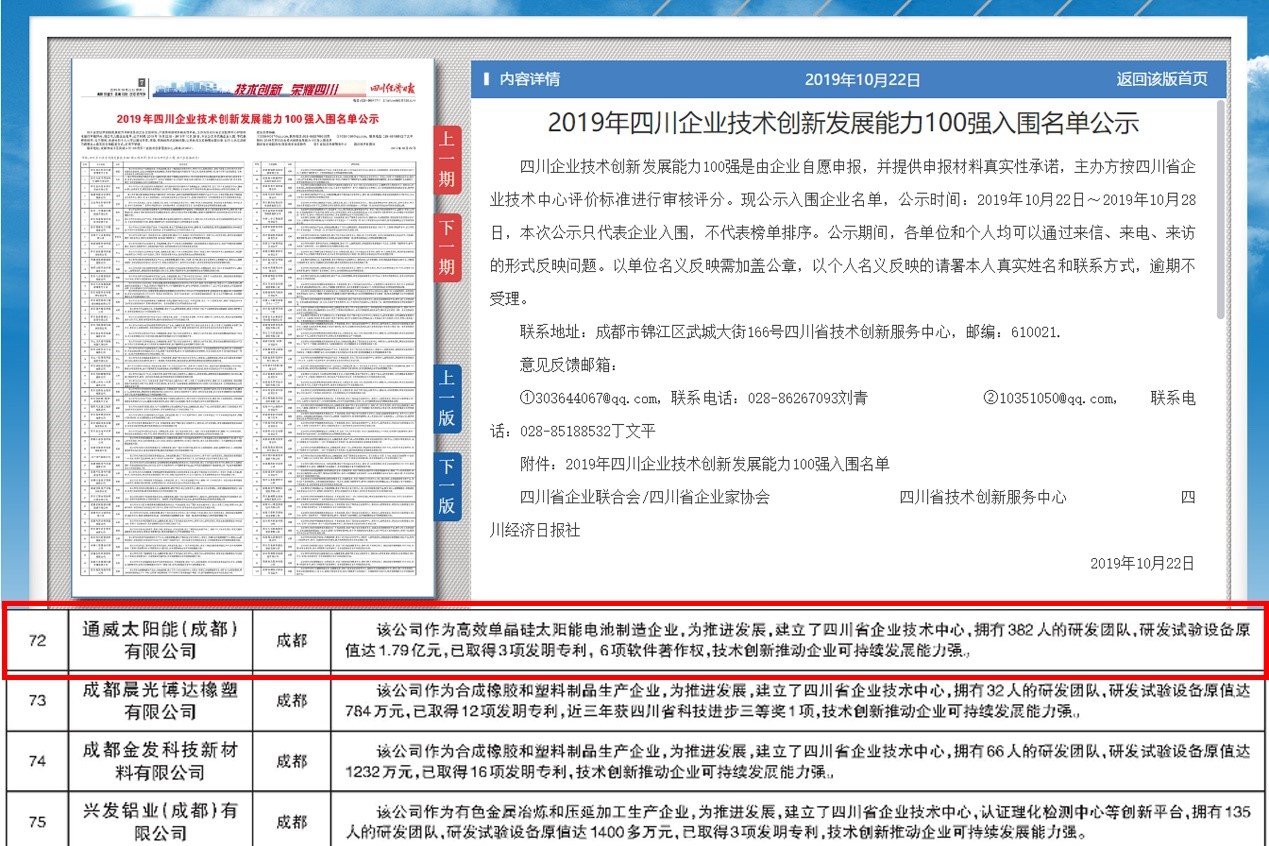 通威太陽能榮獲“四川企業技術創新發展能力100強”等兩項殊榮