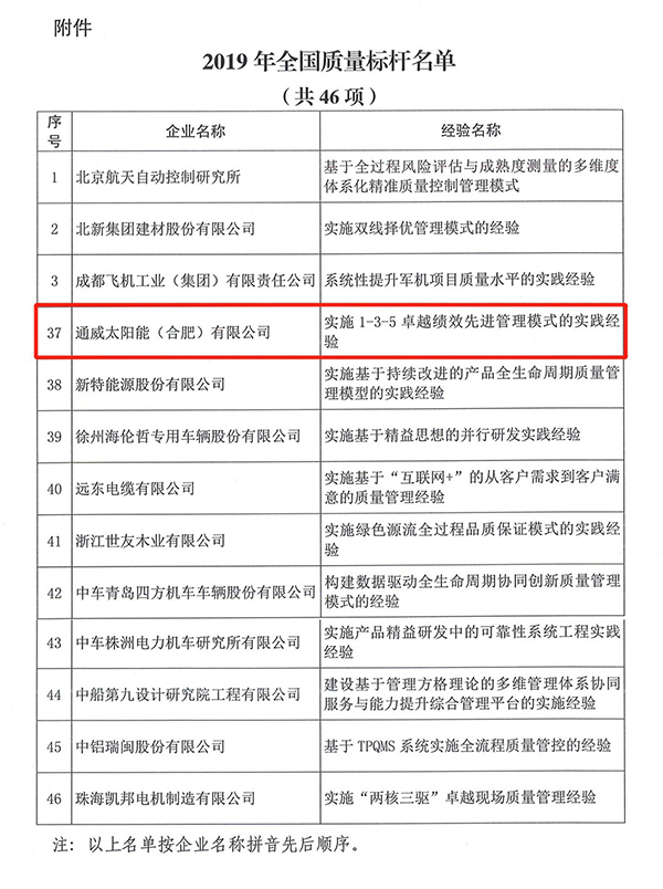 通威太陽能合肥公司榮膺“2019年全國質(zhì)量標桿”殊榮