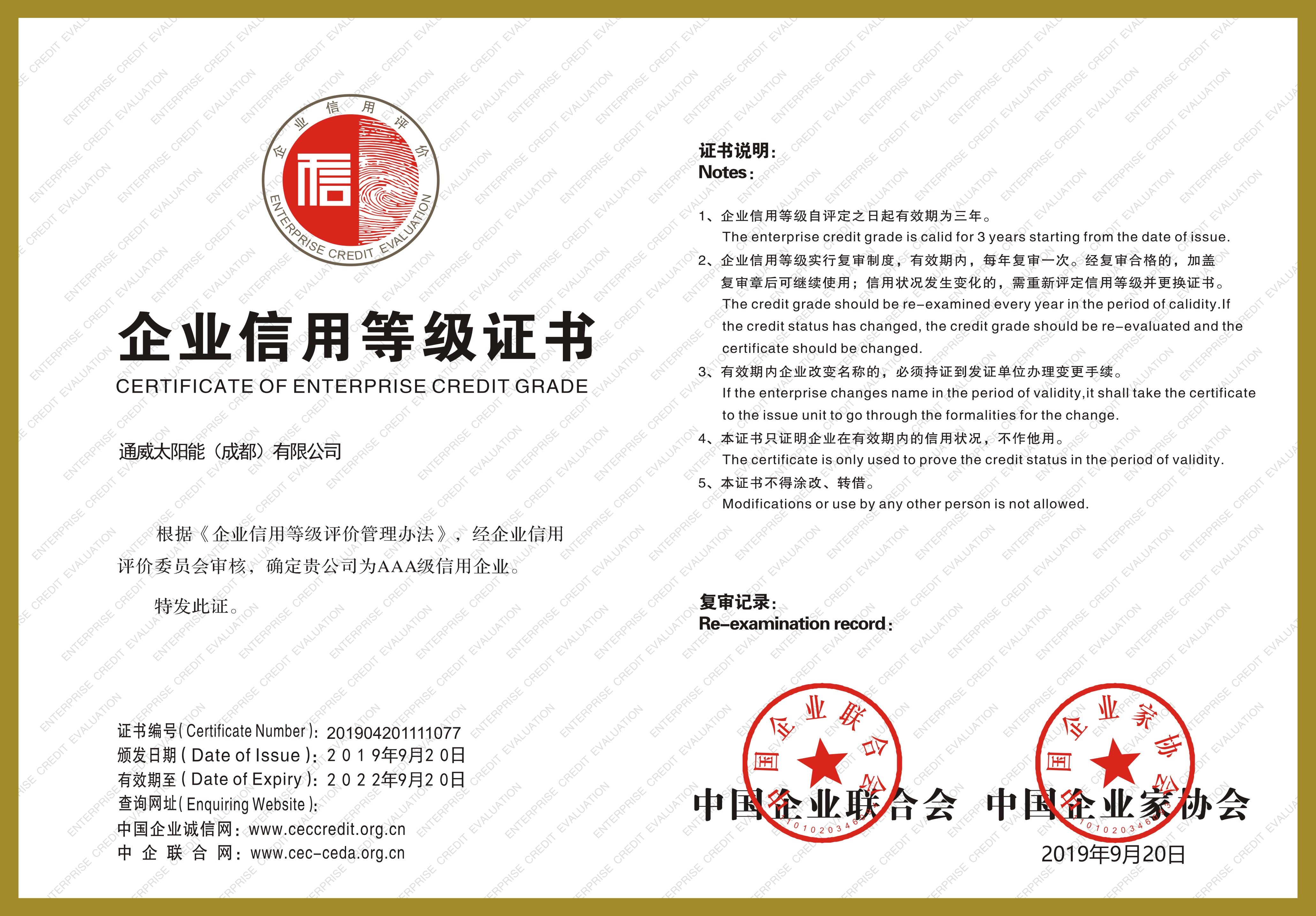 通威太陽能成都公司獲評“AAA級信用企業”稱號