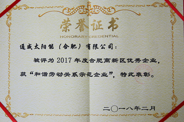 通威太陽能合肥公司榮獲合肥高新區2017年度“和諧勞動關系示范企業”榮譽稱號