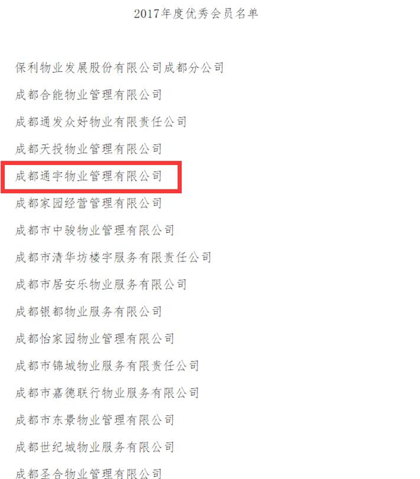通宇物業(yè)獲成都物協(xié)2017年度優(yōu)秀會員單位稱號