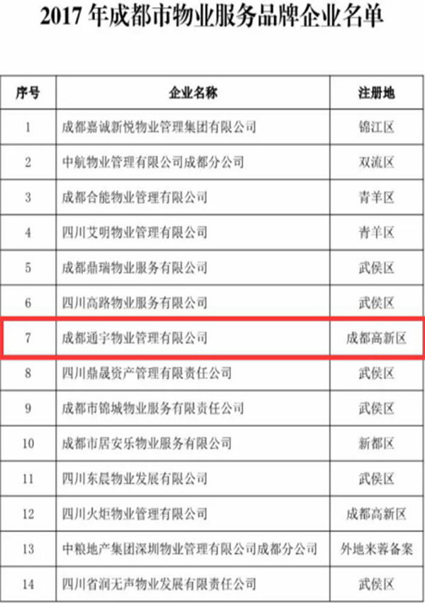 通宇物業(yè)榮獲“2017年成都市物業(yè)服務品牌企業(yè)”稱號