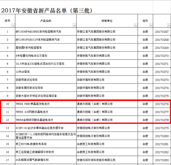 通威太陽能(合肥)有限公司三項(xiàng)產(chǎn)品成功入列2017年安徽省新產(chǎn)品(第三批)榜單